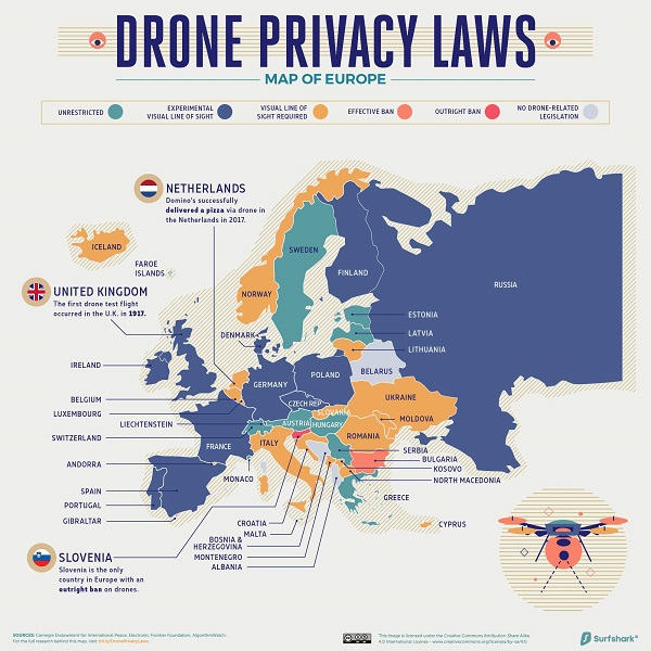 „Сурфшарк“ ги анализирале законите за користење беспилотни летала во 210 земји низ светот. Во најмалку 143 земји е донесена некаква регулатива за дроновите, а повеќето од нив се фокусираат на прецизни правила за нивно користење. Во некои земји беспилотните летала целосно се забранети, во некои се дозволува користење во ограничени околности, а има и земји каде што користењето е неограничено и такви во кои нема закон за користење дронови.