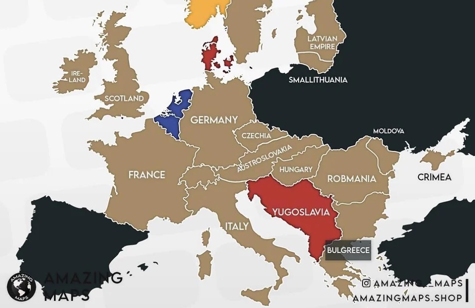 Во 2100 година на политичката мапа нема да ја има ниту Русија ниту Украина, но ќе ги нема и Шпанија и Португалија. Меѓу многубројните нови држави на Стариот Континент повторно ќе се најде Југославија со сите некогашни републики и покраини, но зајакната со Албанија и Данска. Вака изгледа мапата на Европа предвидена од неименуван софтвер за вештачка интелигенција.
