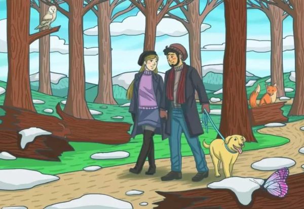 На сликата гледате пар кој со своето куче се шета низ шума. Во шумата можете да видите розова пеперутка, лисица и був. Но, некаде во шумата се крие зајак. Само гениј може да го најде скриениот зајак.