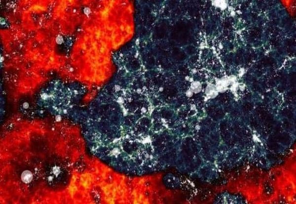 Во оваа симулација на епохата на рејонизација, неутралниот водород (во црвено) постепено се јонизира од првите ѕвезди, покажани во бело.