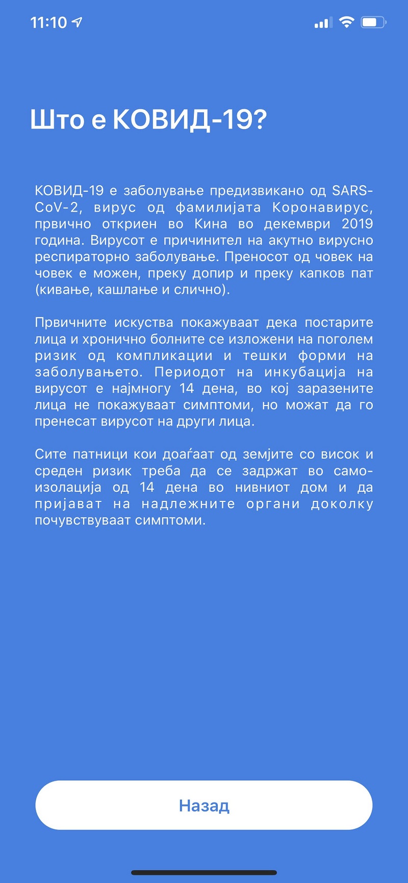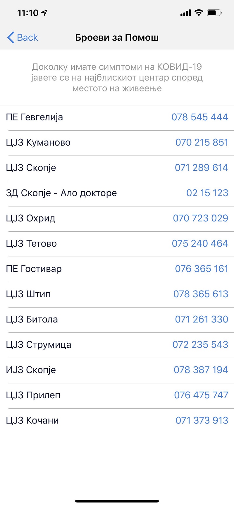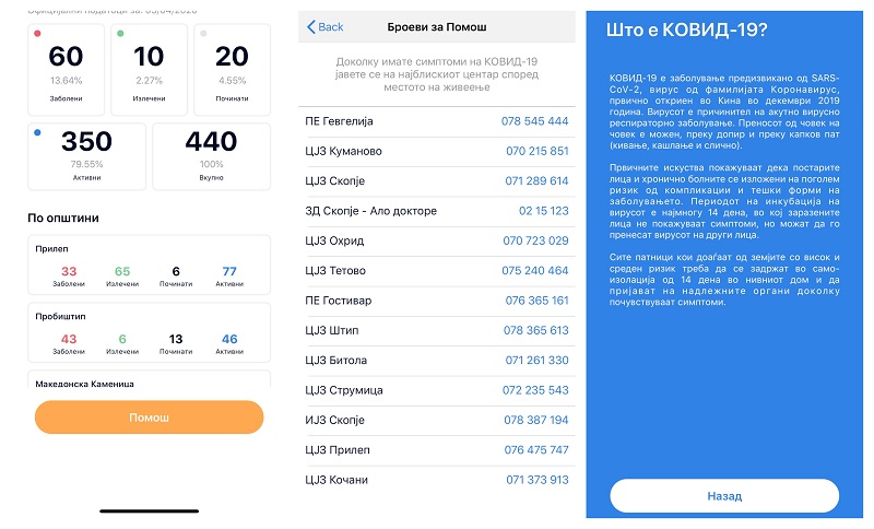 На апликацијата, објаснува тој, во полето Info може да се добие информација за тоа што всушност претставува Ковид-19 и на опцијата за помош во истоименото поле се добива пристап до сите важни телефонски броеви кои се корисни во оваа пандемија, а се сортирани по градови.