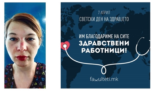 д-р Виолета Огњанова, специјализант по анестезија, реанимација и интензивно лекување, на Светскиот ден на здравјето. Д-р Огњанова е во првата борбена линија на Клиниката за инфективни болести и фебрилни состојби, а фотографијата што ја објави на „Фејсбук“ доволно говори за пожртвуваноста на сите лекари. Во прилог е целосната порака на д-р Огњанова, која ја испраќа преку Факултети.мк: