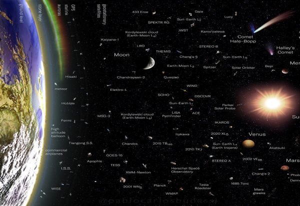 Исто така, на мапата се гледаат и вселенски летала, вклучувајќи го вселенскиот телескоп „Џејмс Веб“, најновиот инфрацрвен телескоп на НАСА, како и вселенската станица „Тиангонг“ на Кина, лансирана во април 2021 година.