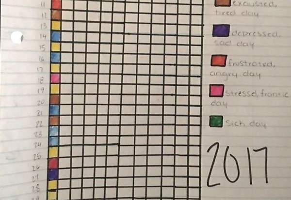 Влегов во нејзината соба и прво што забележав беше таа смешна табела во која таа ги боеше полињата и ја запишуваше состојбата на својот дух, едноставно кажано, за секој поминат ден.Тоа ми беше многу смешно, сè додека не ми објасни.