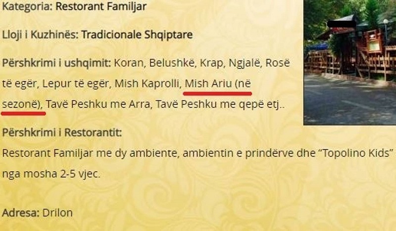 На менито на еден ресторан во Дрилон исто така може да се види и месо од мечка, до што е напишано „во сезона“. На страницата на ресторанот, ажурирана овој месец, се потврдува понудата на ресторанот.