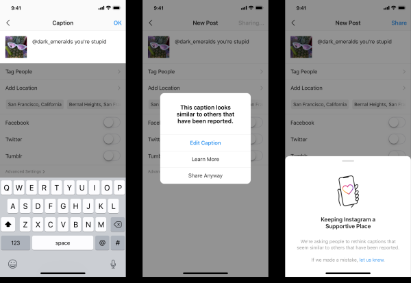 Оние што ќе напишат таква порака ќе добијат кратко известување дека нивниот наслов е сличен на оној што се пријавува како малтретирање и им се советува да размислат за својата порака. „Инстаграм“ ќе им дозволи на корисниците да ја променат пораката пред да ја испратат, доколку е означена како потенцијално навредлива.