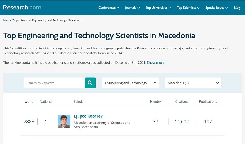 Водечката светска страница за научници Research.com го рангира академикот Љупчо Коцарев, претседател на Македонската академија на науките и уметностите, меѓу врвните научници по инженеринг и технологија.