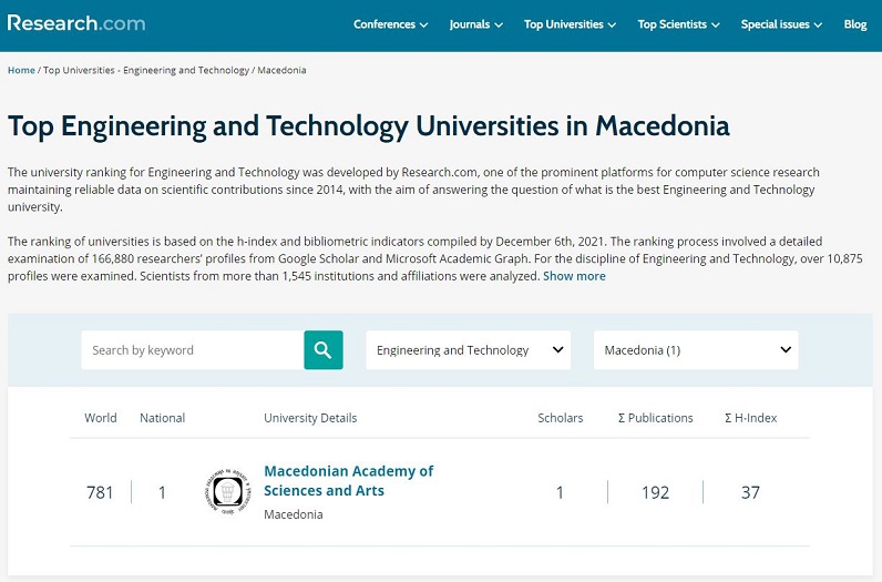 Во меѓувреме, МАНУ се најде на 781. место во рангирањето на универзитетите за инженерство и технологија на истата страница. МАНУ има 192 изданија и Х-индекс 37.