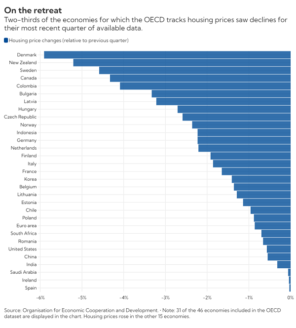 Податоците се однесуваат на цените за последниот квартал, во однос на претходниот период од три месеци. Може да се забележи дека намалувањето на цените на куќите е најголемо во Данска и во Нов Зеланд. Следуваат Шведска, Канада, Колумбија, Бугарија, Летонија, Унгарија и Чешка. Куќите најмалку поевтиниле во Шпанија, Ирска и во Саудиска Арабија.
