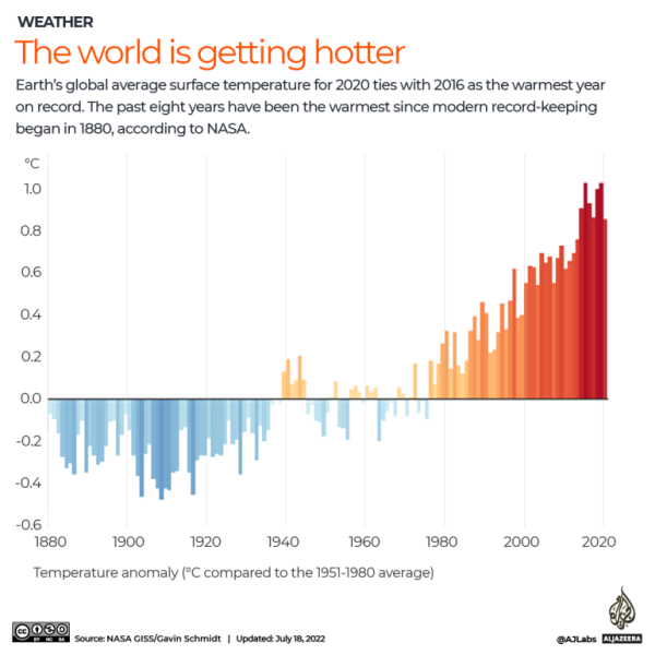 Според температурниот рекорд на НАСА, Земјата во 2021 година била околу 1,1 Целзиусов степен потопла од просекот од крајот на 19 век.