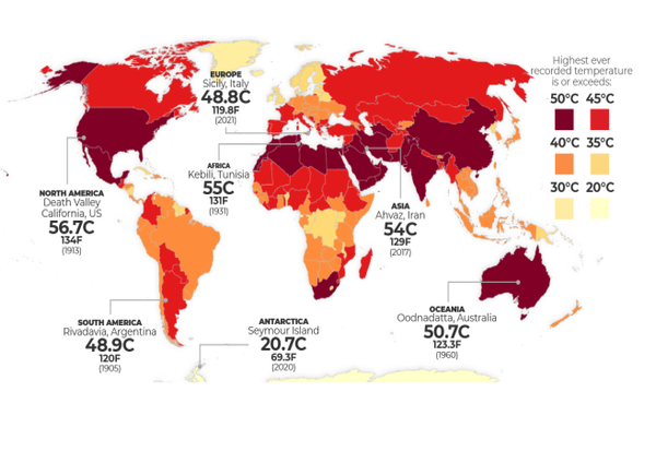 Мапата подолу ги прикажува највисоките температури некогаш забележани во секоја земја низ светот. Најмалку 22 земји забележале максимални температури од 50 Целзиусови степени или повисоки.