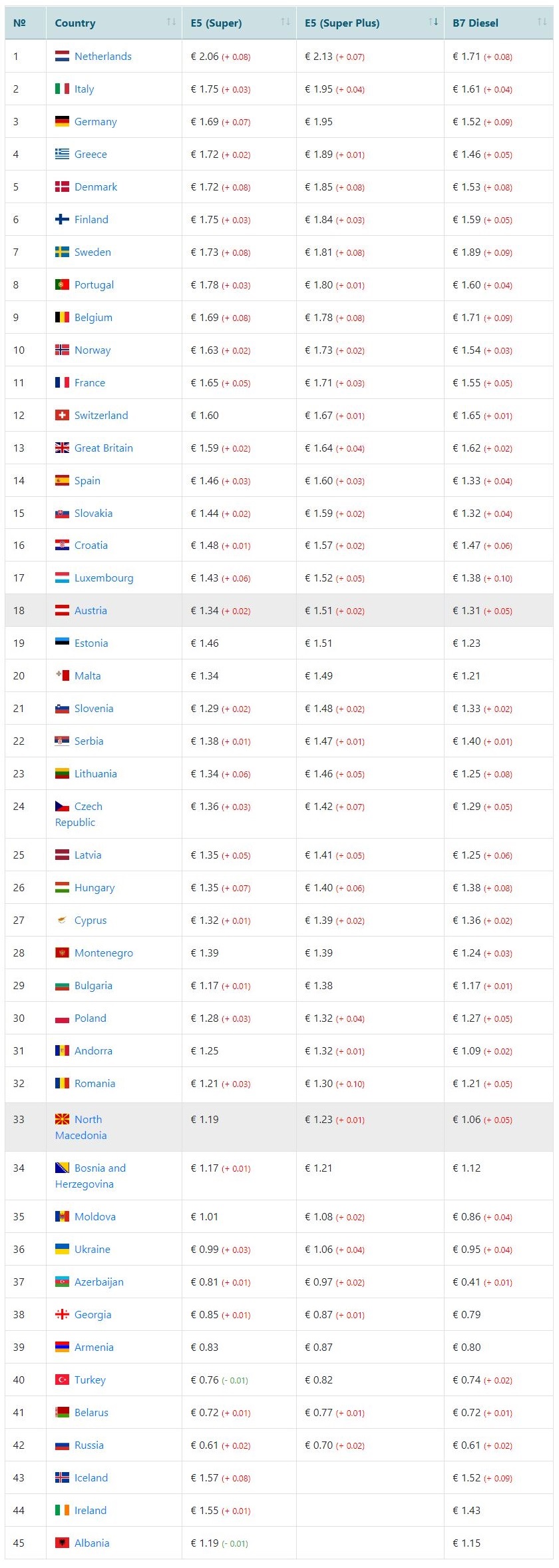 Холандија со моменталната цена од 2,06 евра, односно 2,13 евра за литар бензин е европски рекордер, а околу 2 евра веќе плаќаат и Италијанците и Германците. Од друга страна, Русите, Белорусите и Турците за еден литар бензин плаќаат помалку од едно евро.