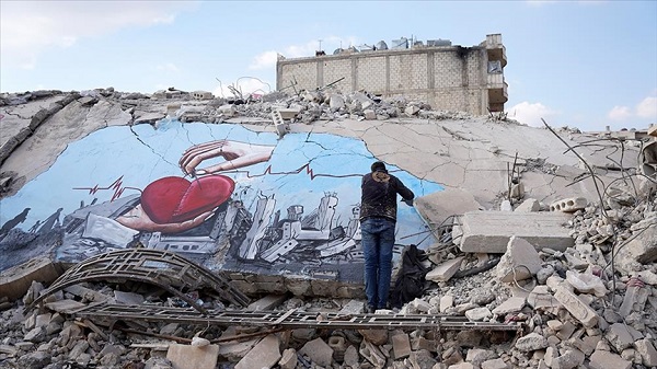 Сириски уметници нацртале потресен мурал на урнатините на зградите во Африк и на тој начин ја изразиле болката предизвикана од земјотресите што неодамна ги погодија Турција и Сирија.