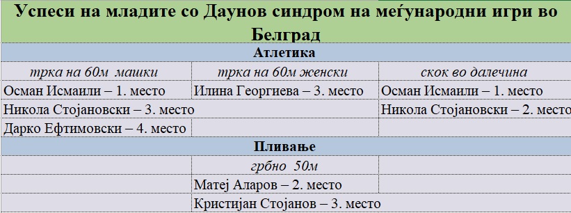 Со седум медали се вратија младите со Даунов синдром од меѓународниот натпревар за лица со посебни потреби „Београд опен 2019“ што се одржа изминатиот викенд. Тие се натпреваруваа во две категории – атлетика и пливање, а лицата со Даунов синдром од македонскиот фудбалски клуб „Карпошово“ одиграа пријателски натпревар со „Мунгоси“ од Србија.