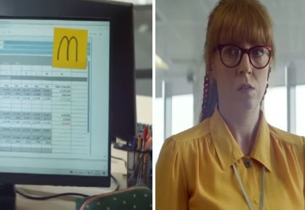 Во рекламата две колешки одлучуваат да се одморат од работата откако едната ѝ сигнализира на другата со буквата „М“ да оди во „Мекдоналдс“ и одејќи кон излезот, цела компанија тргнува по нив. Луѓето се особено воодушевени затоа што на рекламата не се појавуваат хамбургери или друг производ на „Мекдоналдс“, а ниту ресторан.