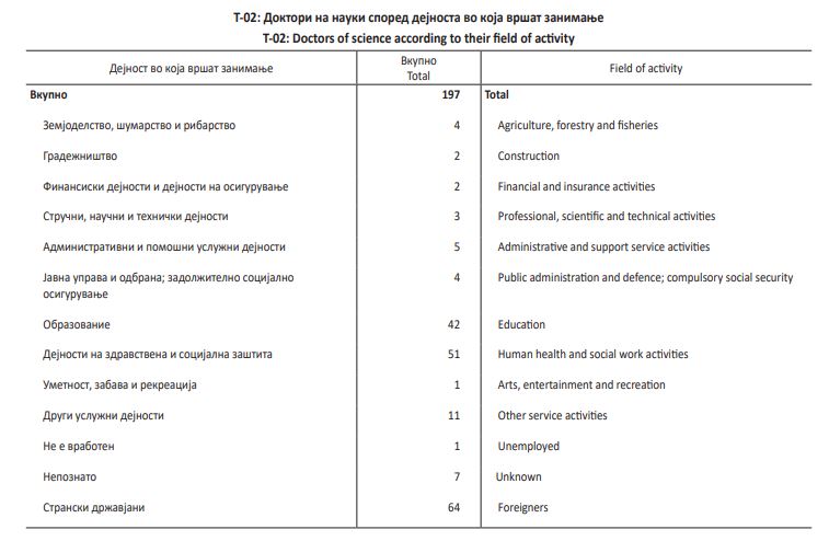 Податоците покажуваат дека според дејноста во која вршат занимање, најголем дел од новите доктори на наука, 64, се странски државјани, 51 се од дејностите на здравствена и социјална заштита, а 52 од образованието.