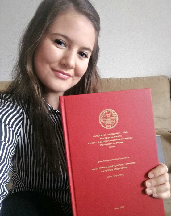 -Во оваа прилика прво сакам да им се заблагодарам на сите мои професори од Катедрата за македонски јазик и книжевност при Филолошкиот факултет. На проф. д-р Виолета Димова и проф. д-р Луси Караниколова-Чочоровска кои беа во комисијата на мојата одбрана, а најмногу на мојот ментор проф. д-р Ранко Младеноски, кој за цело време беспоштедно се залагаше и ме насочуваше – вели Стефановска Костадиновска.