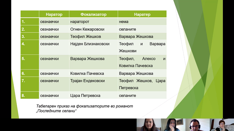 - Сепак, најмногу ме поттикнаа тврдењата за романот „Пиреј“ каде што често при анализите читав дека Јон и Велика ги третираат како наратори (а тие се фокализатори), па така продолжи и моето истражување за останатите романи. Наратор е оној што раскажува во делото, а наратер е оној што го слуша неговото раскажување. Нараторот е субјектот на дискурсот, оној што кажува, односно оној што раскажува за дејството, за настаните во едно книжевно дело. Наратерот, всушност, е оној кому му се обраќа нараторот и тој во лингвистичката комуникација одговара на „ти“. Како на пример во романот „Пиреј“ - Дуко Вендија му раскажува на Роден Мегленоски за неговите родители. Фокализацијата, пак, ја претставува гледната точка на нарацијата, што значи дека е тесно поврзана со нараторот и неговите погледи, но тоа не значи дека нараторот мора да ги искажува само своите погледи, односно потребно е да се изврши дистинкција помеѓу наратор и фокализатор – објаснува Стефановска-Костадиновска.