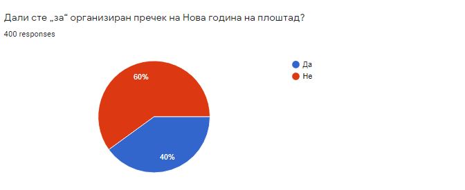 На прашањето: Дали сте „за“ организиран пречек на Нова година на плоштад? одговориле 400 испитаници, од кои 60 отсто или 240 анкетирани одговориле со „не“, а 40 отсто или 160 испитаници дале позитивен одговор.