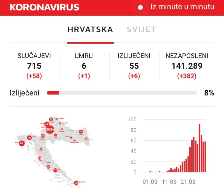 Хрватска секој ден, покрај дневната состојба со болните, новозаразените, излечените и жртвите од коронавирус, објавува и податоци колку невработени има во моментот во земјата.