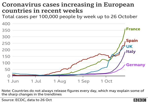 Стапката на инфекција во Европа се зголемува повеќе од 90 дена, известува европскиот Центар за превенција и контрола на болести. Бидејќи властите и експертите се загрижени дека ситуацијата во Европа наскоро може да излезе од контрола, голем дел од владите воведуваат полициски час и социјални ограничувања во обид да избегнат целосни блокади што би можеле да им наштетат на нивните економии и да ја засенат претстојната празнична сезона.