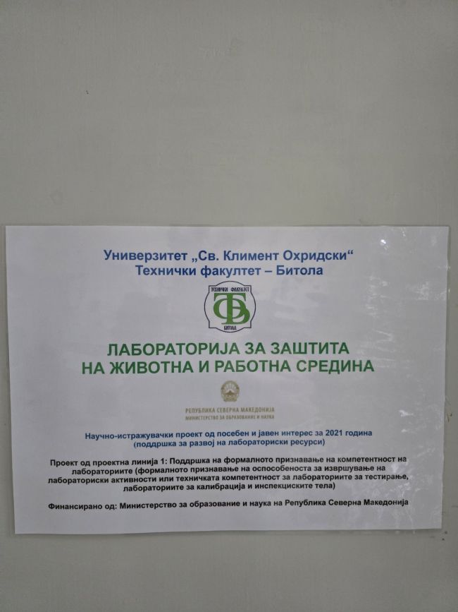 Веќе втора година како работи акредитираната Лабораторија за заштита на животната и работната средина при Техничкиот факултет на Универзитетот „Св. Климент Охридски“ во Битола. Таа е единствената универзитетска лабораторија во државата со акредитација за ваква намена. Врши мерења на бучавост, штетни гасови од оџаци и услови во работните средини. Нејзиното постоење е вистинско олеснување и намалување на трошоците за компаниите од Југозападна Македонија зашто претходно одредени мерења кои беа законски обврзани мораа да ги спроведат ангажирајќи приватни акредитирани компании од други градови.