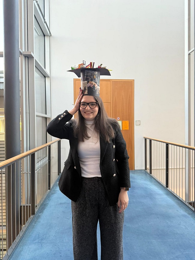 - За мене, ова беше едно многу пријатно и забавно искуство. Немав чувство дека се наоѓам на испит, туку како да имам интересна и стимулирачка дискусија за истражувањето на кое посветив 4 години, со светски реномирани експерти од различни гранки на биологијата. Мојот омилен дел од секоја одбрана на докторати е германската традиција на декорирање на капата од страна на колегите со предмети и изработки што се поврзани со вашето хоби, тема на истражување, карактер итн. На креативноста обично ѝ нема граници – раскажува Ана.