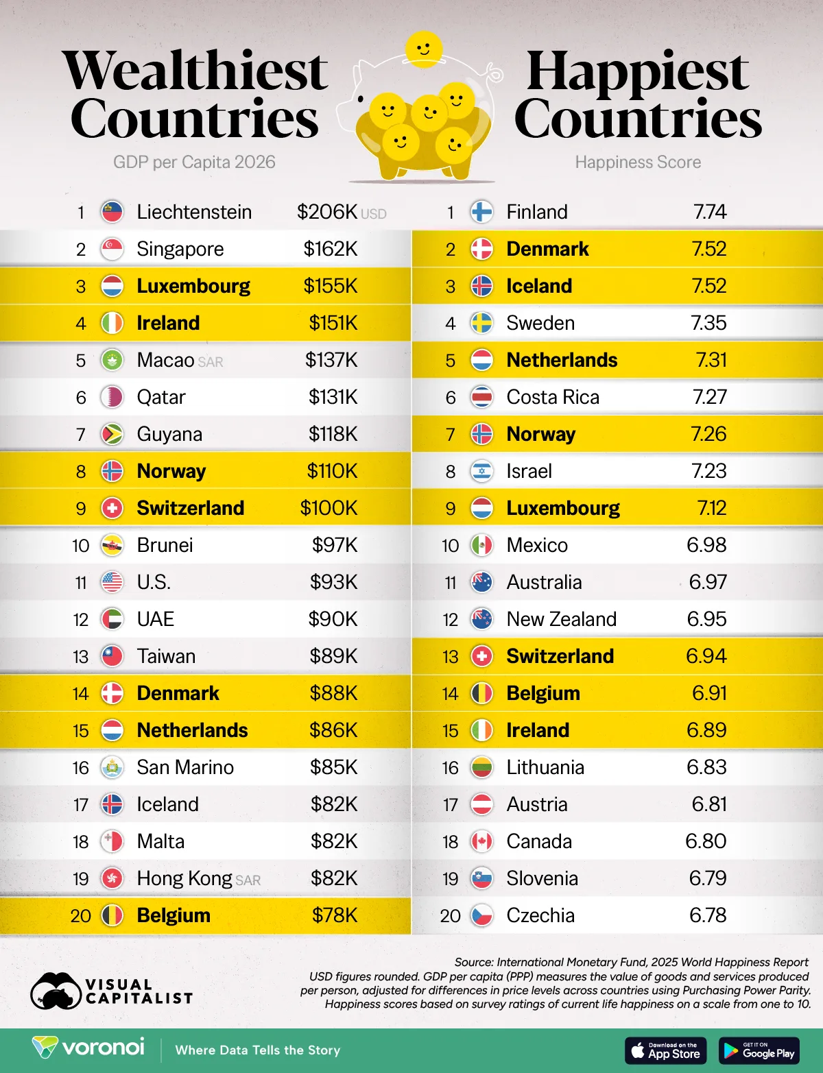Само неколку земји се во првите и на двете листи. Данска, Исланд, Норвешка, Луксембург, Швајцарија, Ирска и Холандија се ретки примери каде што високите приходи се совпаѓаат со високото задоволство од животот.