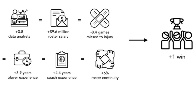 Статистиката покажува дека во 2009 година имало вкупно десет аналитичари на податоци што работеле во НБА, а во 2023 година нивниот број пораснал на 132, при што некои тимови вработиле повеќе аналитичари од другите. Бројот на вработени во одделот за аналитика имал позитивен и статистички значаен ефект, дури и кога биле земени предвид факторите како што се платите, искуството и хемијата меѓу играчите, постојаноста на стручниот штаб и повредите на играчите во текот на сезоната. Дури и со сите овие влијанија, длабочината на клупата на тимот за анализа на податоци останува постојан предвидувач за победите на тимот.