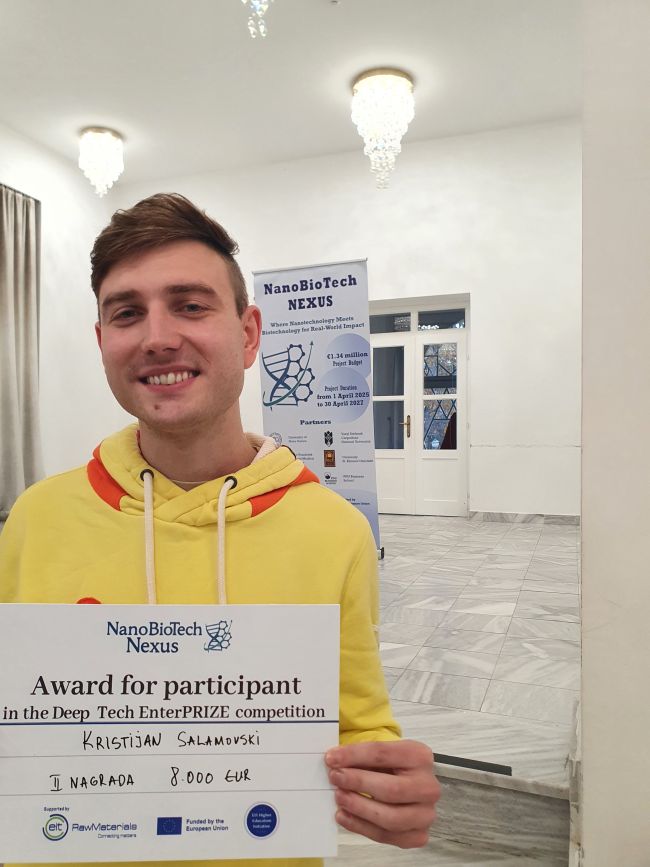 - Средствата од наградата се наменети за апликативни цели, односно практична примена и ќе бидат употребени според намената и во координација со донаторите, а тоа е NanoBioTech проектот, за што сум му навистина благодарен на мојот Универзитет „Св. Климент Охридски“ - Битола за иновативноста и огромната поддршка што ни ја дава нам, на студентите, преку ваквите иницијативи - вели Саламовски.