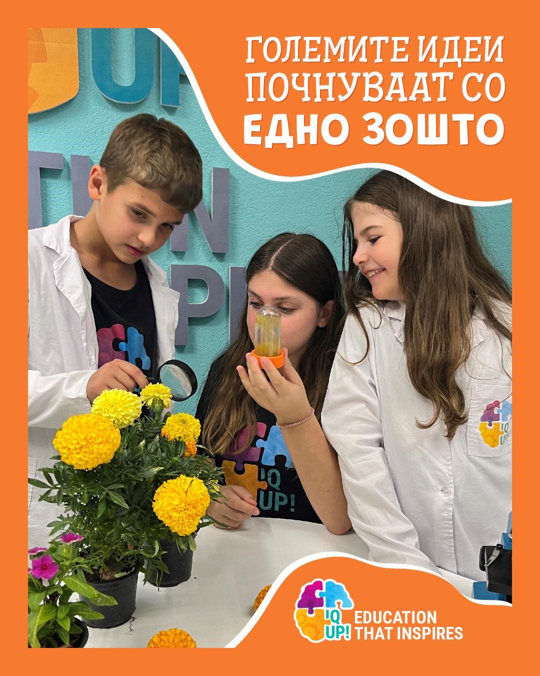 IQ UP! – преку СТЕМ-методологија (наука, технологија, инженерство и математика) да им овозможи на децата да го истражуваат светот преку прашања, експерименти и логичко размислување. Во IQ UP! учењето е авантура, а секој час – мал чекор кон откритие.