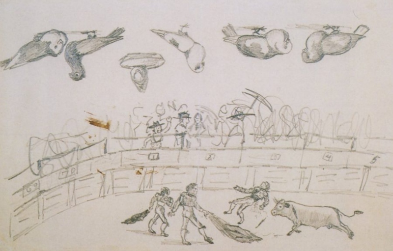 Видете го и цртежот од следната година во неговиот ран развој, „Борба со бикови и гулаби“. Ова дело, со реалистични птици внимателно нацртани наопаку врз лабава скица од борба со бикови, се појавило на изложба во 2006 година во колекцијата „Филипс“ во Вашингтон, каде што биле претставени уметнички дела од детството на Пикасо и Пол Кле. Кураторот Џонатан Фајнберг забележува: „Самоуверената, разиграна чкртаница на 9-годишниот Пикасо“ ни дава повеќе индикации за неговиот талент отколку фино нацртаните птици.