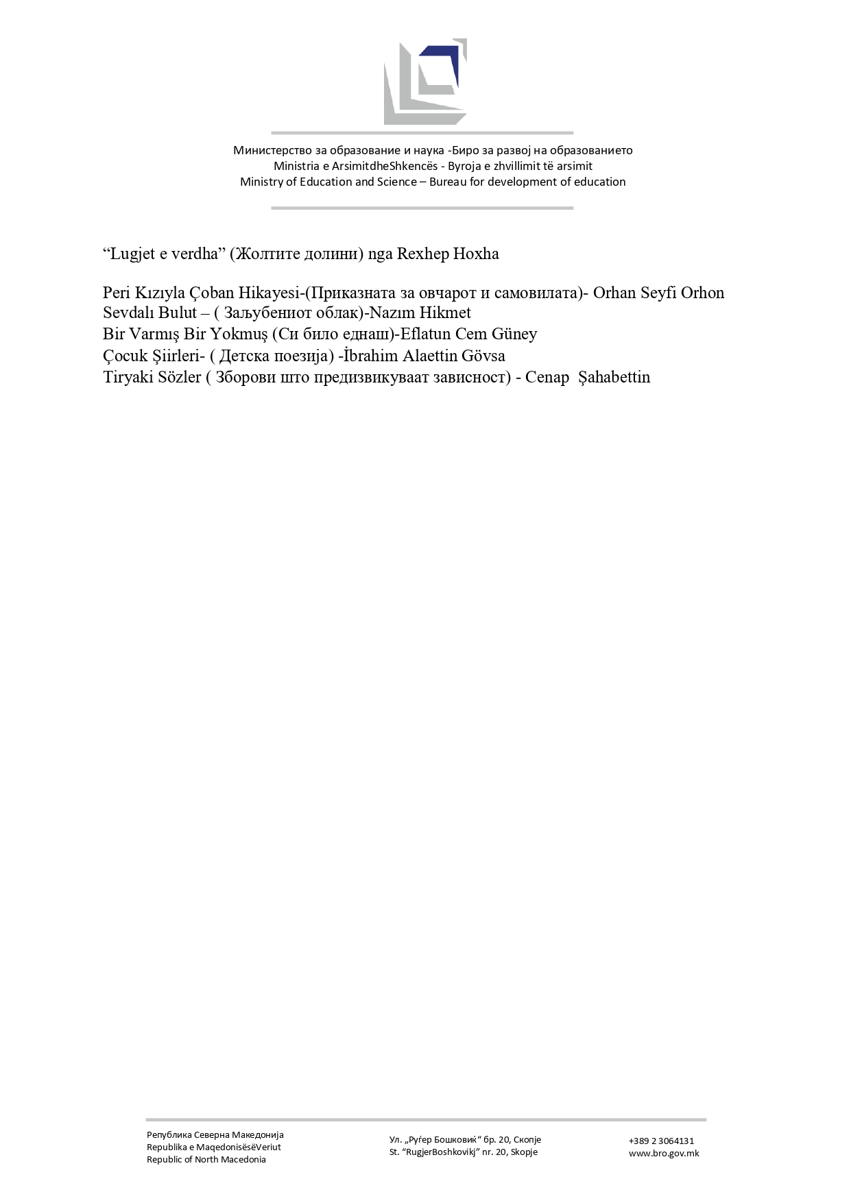 Списокот со лектири за основно образование ќе се менува. Министерството за образование и наука и Бирото за развој на образованието организираат јавна дискусија за нов предлог-лектирен список за основното образование и упатуваат покана до сите заинтересирани страни - наставници, стручни служби и други чинители во образованието - активно да се вклучат во дефинирање на современ, инклузивен и квалитетен лектирен список, кој ќе одговара на реалните потреби на учениците и наставниот процес.