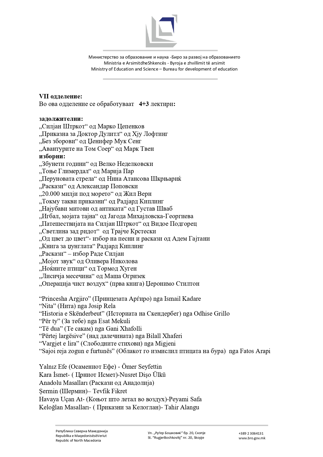 -Потребата од ажурирање на лектирниот список произлегува од стремежот за постојано усогласување на наставните содржини со современите образовни цели, развојните карактеристики на учениците и нивниот социјален и емоционален контекст. Предлог-списокот е изработен врз основа на списокот што се реализира во наставата од учебната 2019/2020 година. Одредени наслови се отстранети поради ниска читаност, несоодветност на возраст или содржина. Поради промени во наставните програми и интердисциплинарно поврзување во наставата, некои дела се преместени во друго одделение или добиле нов статус – од задолжителни станале изборни и обратно. Во предлогот се вклучени дела што обработуваат современи и значајни теми, меѓу кои: идентитет и самодоверба, пријателства и меѓучовечки односи, училиштен живот и булинг, емоционални и психолошки предизвици, културна разноликост, инклузија на деца со посебни образовни потреби. Целта е учениците да читаат содржини блиски на нивната реалност, но и доволно слоевити за анализа и симболичко толкување, што ќе поттикнува критичко размислување, дискусија и личен развој - стои во соопштението на МОН.