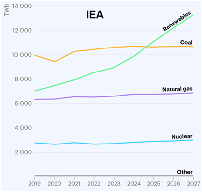 Сегашните трендови исто така укажуваат дека се очекува изворите со ниски емисии на стакленички гасови да се прошират доволно брзо за да го задоволат целиот раст на глобалната побарувачка за електрична енергија до 2027 година, а тоа би било значајна пресвртница. И покрај тоа, емисиите на стакленички гасови, особено јаглерод диоксид, ќе растат и следните неколку години бидејќи учеството на фосилните горива е сѐ уште големо.