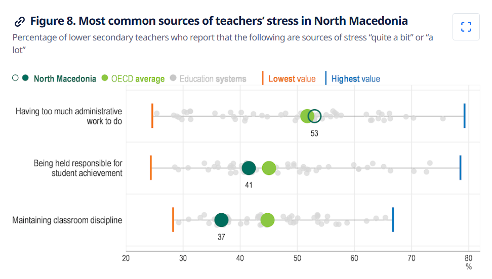 Најчести причини за стрес меѓу наставниците се административните обврски, одговорноста за ученичкиот успех и одржувањето на дисциплината во училницата. Сепак, интересно е што само 6 отсто од наставниците пријавиле дека се под силен стрес, што е значително пониско од просекот во ОЕЦД, каде што оваа бројка достигнува речиси 20 отсто.