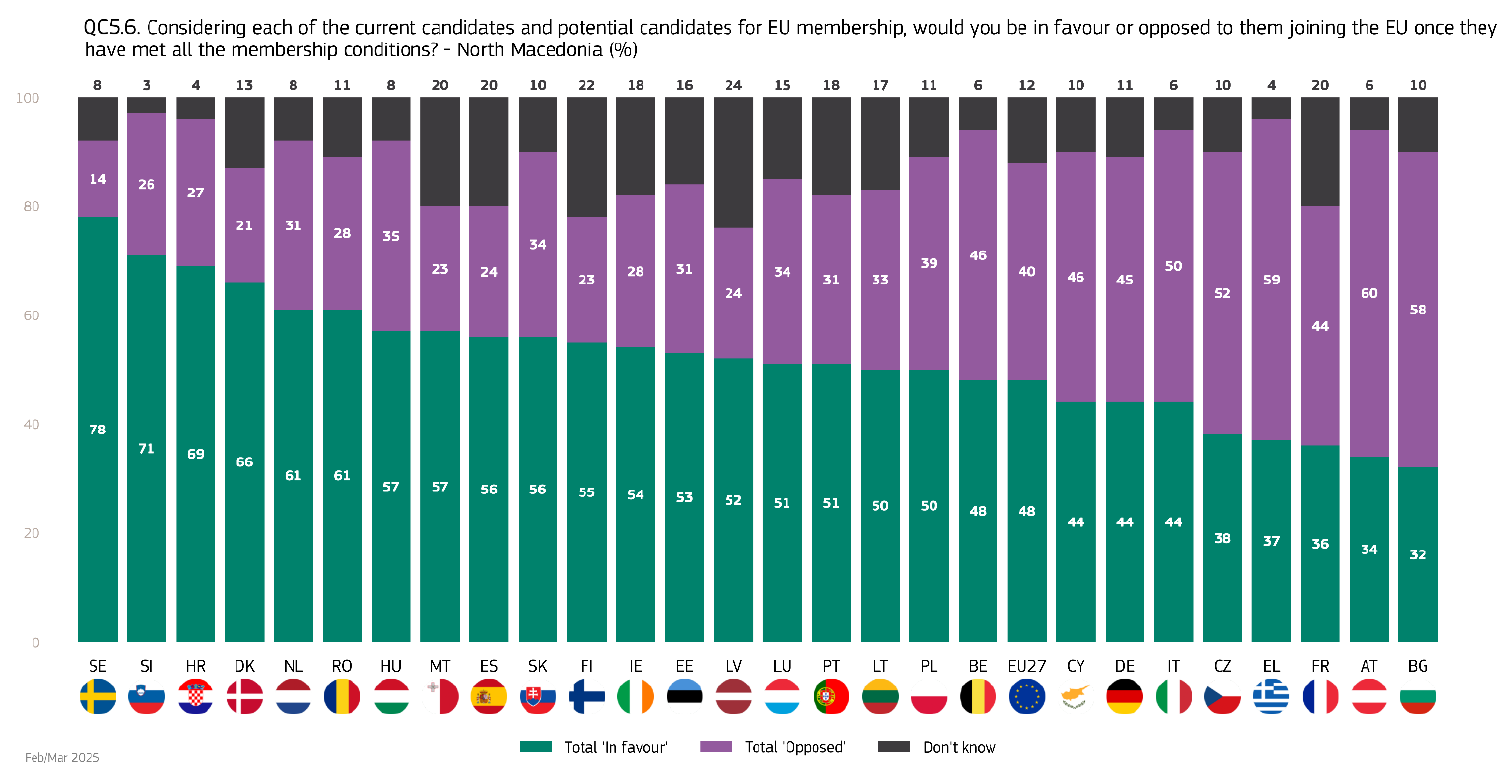 Речиси половина од испитаниците од земјите членки на Европската Унија, односно 48 проценти, се за Македонија да влезе во Унијата штом ќе ги исполни условите, покажува најновиот извештај од „Евробарометар“ за февруари-март 2025, објавен месецов. Меѓу нив, еден од десетмина изразува силна поддршка (10 %), додека нешто помалку од две лица од пет се прилично за влез на земјава во ЕУ (38 %).