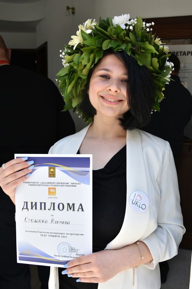 - Иако многу млади луѓе размислуваат за можности во странство, јас верувам дека моето место и мојот труд ќе бидат најдобро прифатени и препознаени овде, во мојата родна држава. Македонија, со сите нејзини предизвици и потенцијали, за мене претставува идеално место за личен и професионален развој. Како идна професорка по македонски јазик, сметам дека ќе можам да се остварам на највисоко ниво ако останам овде, работејќи со љубов на зачувување и развој на мојот мајчин јазик.