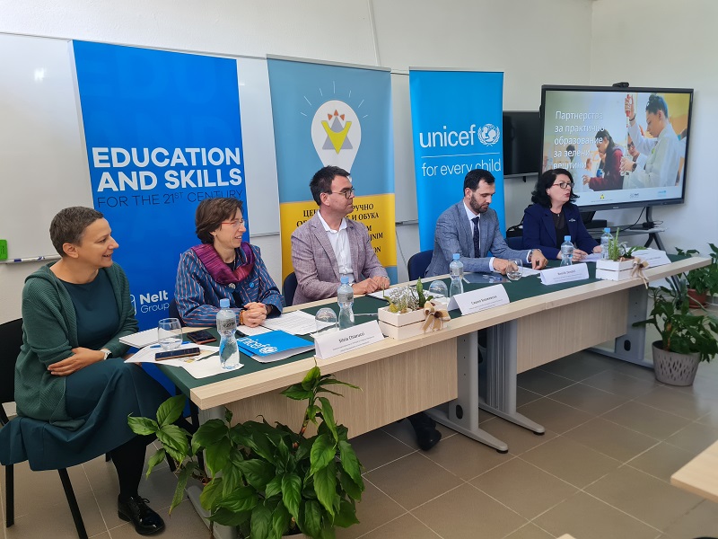 Благодарение на партнерствата со Групацијата Нелт и Шведска, УНИЦЕФ го поддржува Министерството за образование и наука и Центарот за стручно образование и наука за развој на зелени наставни програми, обуки за наставниците и менторите, и олеснување на практичната настава со цел сите ученици во СОО да учат за животната средина и климата низ призмата на нивната струка.