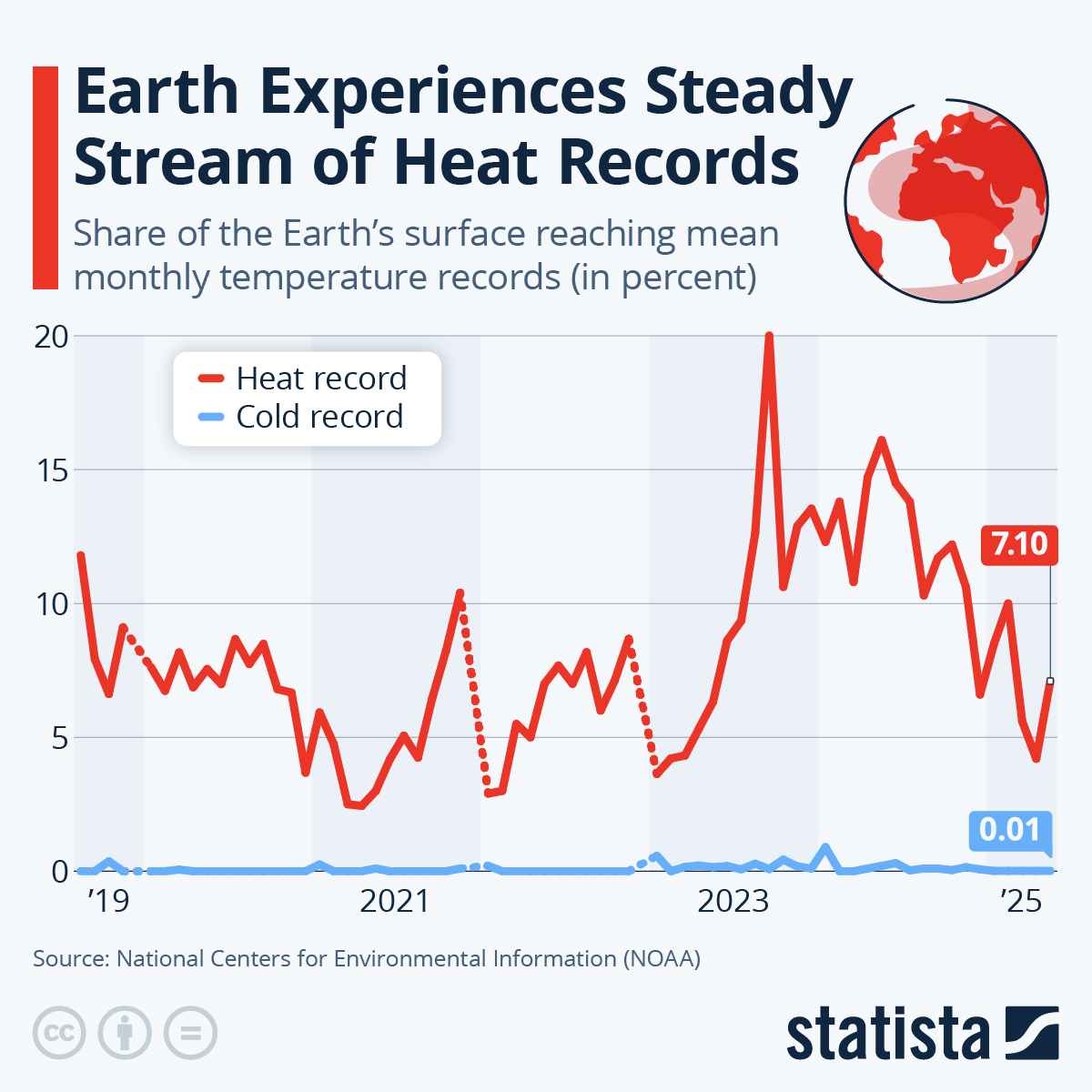 Во текот на изминатите две децении се зголеми зачестеноста на новите рекорди на жештина. Во мај годинава на околу 7 отсто од површината на планетата биле срушени локални температурни рекорди, ниво што би било ретко пред само неколку децении.