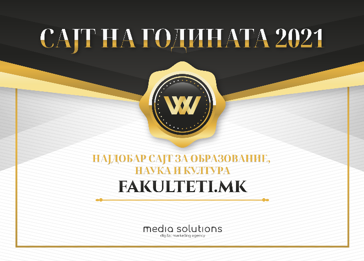 Факултети.мк е победник во категоријата најдобар сајт за образование, наука и култура за 2021 година, на манифестацијата „Сајт на годината 2021“.