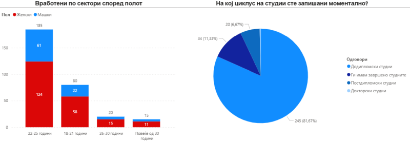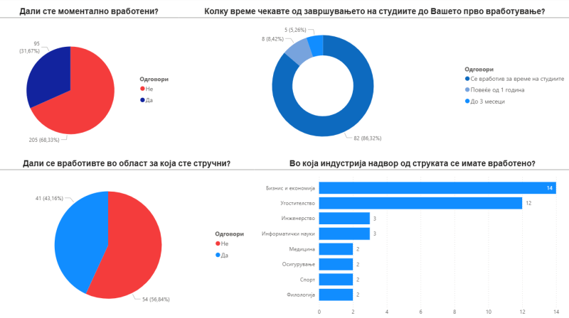 Значаен број од студентите споделиле дека се веќе вработени уште за време на нивните студии, тренд што може да се гледа како позитивен показател за зголемена иницијативност и рана интеграција во работната средина. Сепак, зад овој факт се крие и една важна порака: формалното образование сѐ почесто не ги задоволува економските потреби на младите, а пазарот на труд бара побрз и пофлексибилен пристап кон вработување.