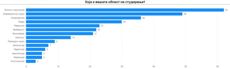Интересен е и податокот дека голем дел од студентите работат во сектори кои не се поврзани со нивната стручност. Најмногу се вработиле во бизнис и економија, па следуваат угостителството и други услуги, што укажува на отвореност на овие индустрии за млад кадар, но и на недостиг од можности во нивната примарна област на студирање.