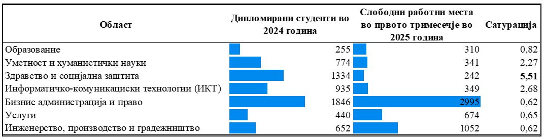 Понудата и побарувачката на труд не се само статистички категории, туку се живи, променливи процеси. Презаситеноста во здравството и социјалната заштита и информатичко-комуникациските технологии укажува дека зголемената популарност на овие области не била проследена со системско планирање. Индустриите каде што има реален недостиг, бизнис и администрација, инженерство, производство и градежништво бараат млад кадар, но таквиот кадар сè уште не излегува во доволен број од образовните институции. Ова е индикатор за потребата од ревизија на уписните политики и моделирање на образовната понуда.
