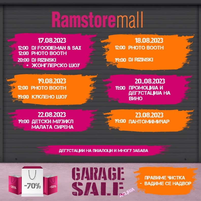 Покрај големите попусти, посетителите на „Рамстор мол“ ќе можат да уживаат во богатата програма, специјално организирана за овој настан, која содржи многу музика во придружба на добро познатите DJ FOODIMAN & SAX, кои свечено ќе го одбележат стартот на најголемата распродажба во градот - Garage Sale.