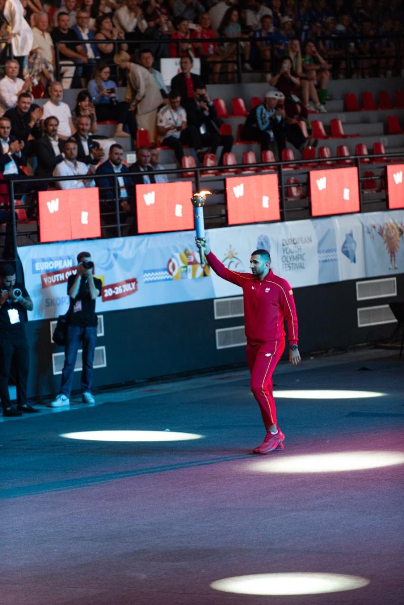 Еден од најемотивните моменти на вечерта беше пристигнувањето на македонскиот олимписки теквондист Дејан Ѓоргиевски, кој како прв носител на Пламенот на мирот и солидарноста ги поздрави присутните во арената, најавувајќи го симболичното патување на факелот. Потоа се приклучија и македонските спортски херои Мила Релиќ, Бобан Илиоски, Дивна Пешиќ, Берат Јакупи и Пулексенија Јованоска, а факелот официјално го запали нашиот најдобар атлетичар Дарио Ивановски. Со овој чин беа симболично обединети трите града домаќини – Скопје, Куманово и Осиек – и беше промовирана идејата на ЕМОФ Скопје 2025 како настан што го обединува континентот преку спорт, култура и солидарност.