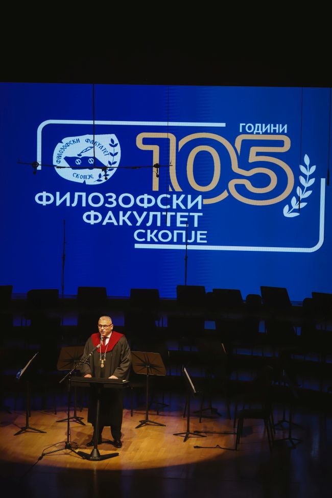 - Кога ќе се направи паралела меѓу Филозофскиот факултет некогаш и сега нема големи разлики. И тогаш и сега целите се исти – жарот е ист, ентузијазмот е ист, посветеноста и љубовта кон професијата остануваат непроменети. Иста е задачата да продолжиме да го исполнуваме аманетот на нашите предци и просветители од дамнешни времиња, а тоа подразбира да продолжиме да бидеме живиот глас кој ќе пулсира со текот на времето и во просторот. Тоа што ги обединува минатото и сегашноста е истата борба и стремеж и потрагата по знаење, иста верба во науката, истa научна љубопитност и истата мисија да се создаваат генерации кои ќе ја движат државата напред. Во минатото, во самите почетоци со скромни можности и ограничени ресурси, а денес, со современи технологии, дигитална трансформација и зголемена меѓународна соработка, вештачка интелигенција, факултетот ја има истата задача – да биде столб на образованието, науката и културата, да биде образовен храм на студенти и професори кои со својата љубов кон професијата ја градат иднината. И затоа со право се зборува дека факултетот остана да биде мост меѓу традицијата и современоста, меѓу минатото и иднината, меѓу националното и глобалното - истакнува деканот Бакрески.