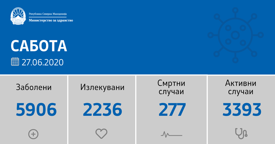 Вкупната бројка на ковид дијагностицирани во нашата земја од почетокот на епидемијата изнесува 5906, бројката на оздравени пациенти е 2236, на починати е 277, а во моментов бројот на активни случаи во земјата изнесува 3393.