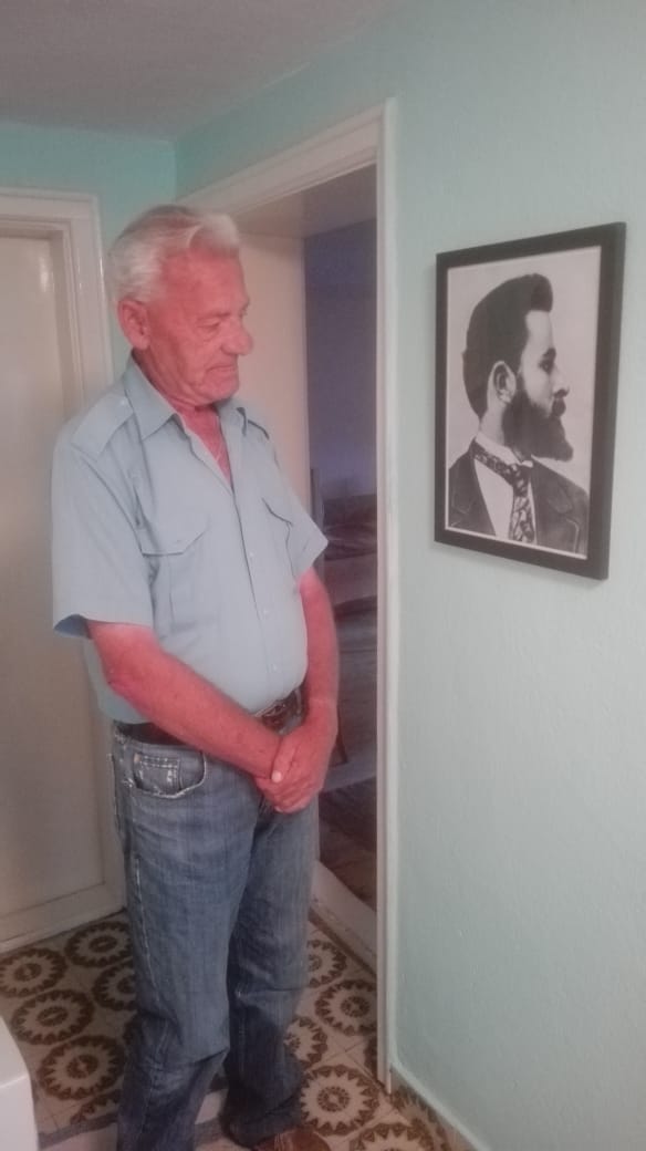 Трајко Карев, пред портретот на дедо му, Никола Карев Фото: Трајче Крстески