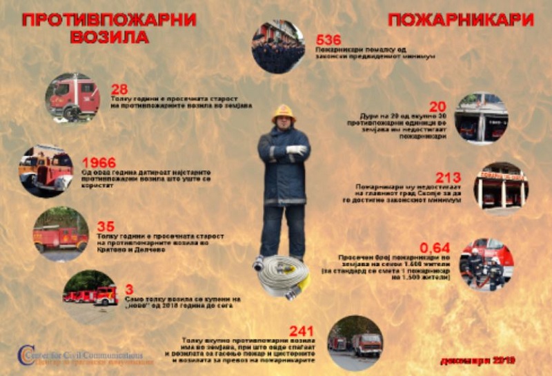 Во земјава недостигаат 536 пожарникари за да се достигне законски пропишаниот минимум, а просечната старост на противпожарните возила е 28 години, покажува истражувањето што го изработи Центарот за граѓански комуникации.